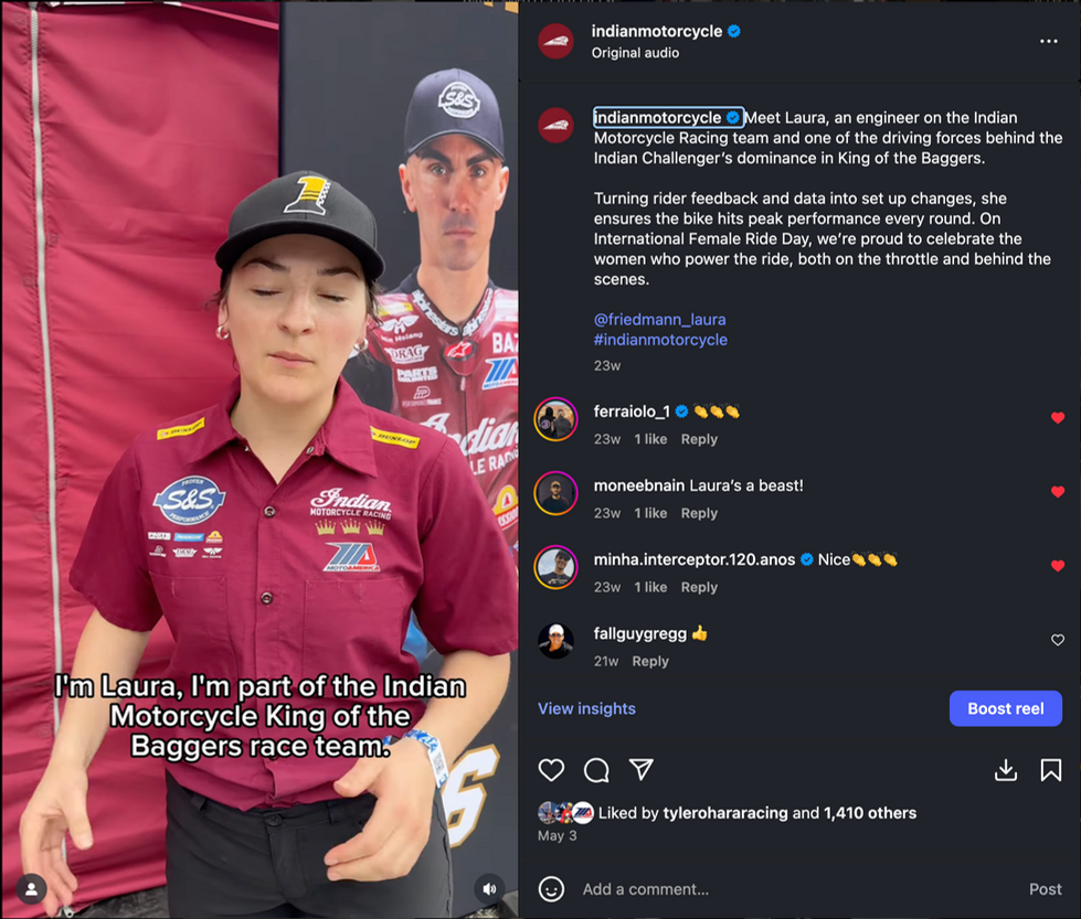 I attended MotoAmerica races on behalf of the Indian Motorcycle Racing Team to provide live event coverage across social channels. During downtime, I focused on capturing behind-the-scenes stories that showcased the people who make racing possible. One feature highlighted a female engineer and her vital role on the team, a story that was especially meaningful to me as a woman in a male-dominated industry. The content resonated deeply with our audience and performed exceptionally well across platforms.